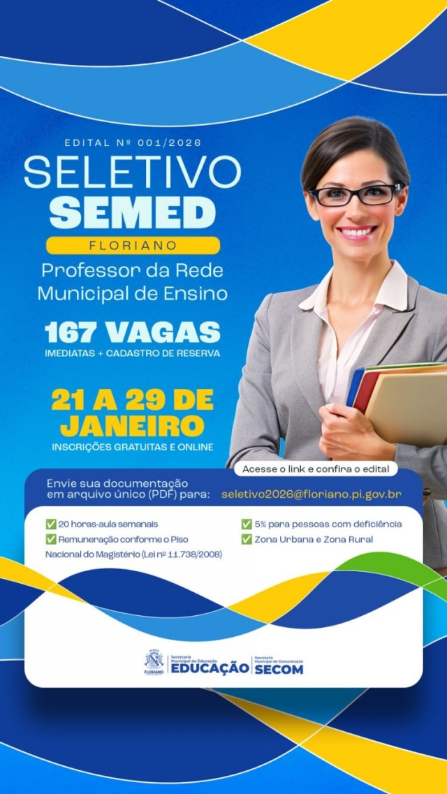 A Prefeitura de Floriano, por meio da Secretaria Municipal de Educação (SEMED), lançou nesta quarta-feira, 21 de janeiro, o Edital nº 001/2026, que dispõe sobre a realização de processo seletivo simplificado para contratação temporária de professores para a rede municipal de ensino, contemplando 167 vagas imediatas e formação de cadastro reserva.