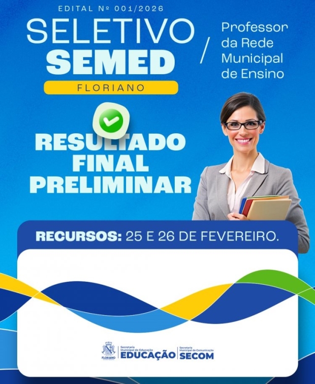 A Prefeitura de Floriano, por meio da Secretaria Municipal de Educação (SEMED), divulgou nesta quarta-feira, 25 de fevereiro, o resultado final preliminar do Processo Seletivo Simplificado para a contratação temporária de professores que irão atuar na rede municipal de ensino, conforme o Edital nº 001/2026.