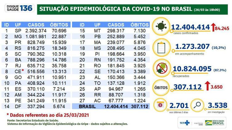 Os dados estão na atualização do Ministério da Saúde divulgada na noite desta sexta-feira (26). O balanço é produzido com as informações coletadas pelas autoridades estaduais e locais de saúde.