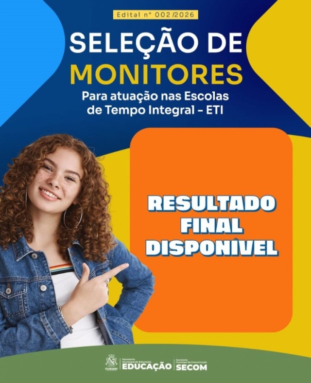 A Prefeitura de Floriano, por meio da Secretaria Municipal de Educação (SEMED), divulgou nesta terça-feira, 24 de março, o resultado final do processo seletivo simplificado para a contratação de monitores que atuarão nas escolas de Tempo Integral (ETI) da rede municipal de ensino, conforme previsto no Edital nº 002/2026.
