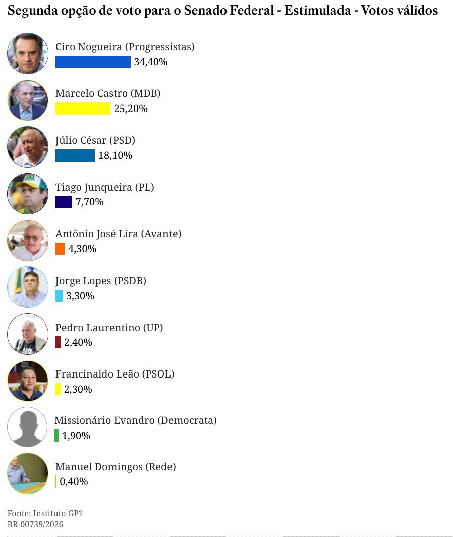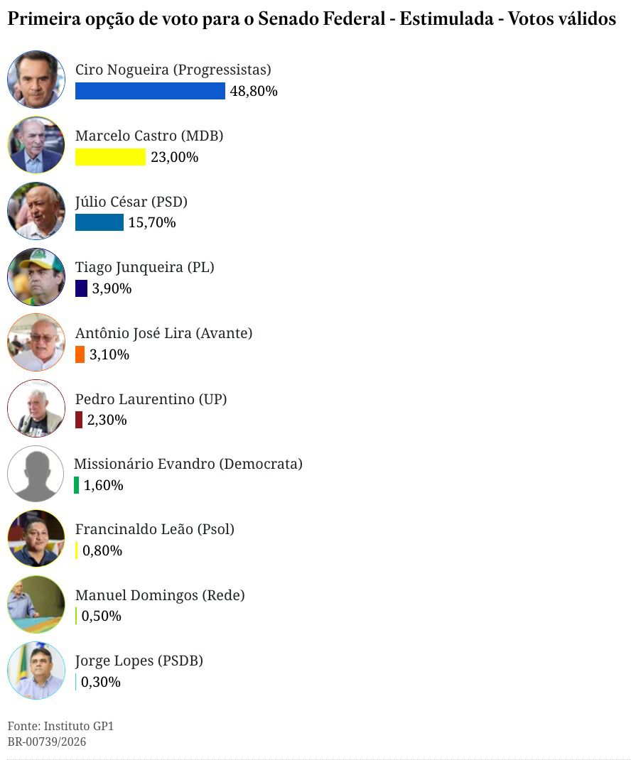 O senador Ciro Nogueira (Progressistas) se consolida como pré-candidato a reeleição e lidera em todos os cenários na mais nova pesquisa do Instituto GP1, divulgada nesta segunda-feira.