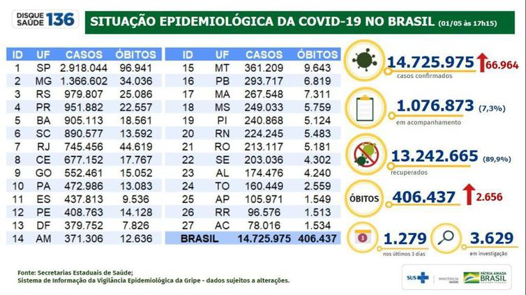 O total de pessoas infectadas desde o início da pandemia totalizou 14.725.975. Entre ontem e hoje, foram registrados 66.964 novos diagnósticos positivos de covid-19.