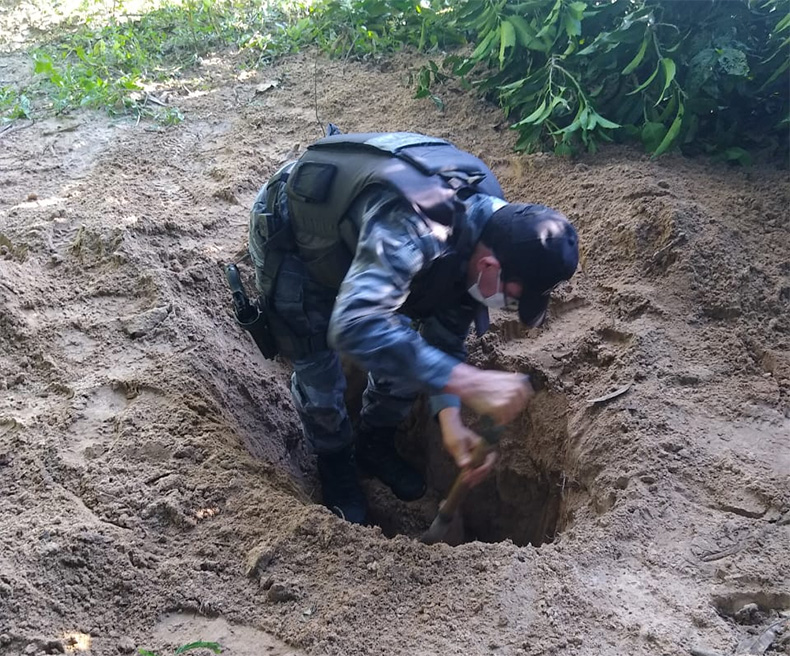 “Feito uma varredura na área de mato, localizamos uma suposta cova, iniciamos uma escavação, onde fora encontrado indícios de um cadáver e solicitamos apoio do Corpo de Bombeiros”, informou o relatório da Força Tática.