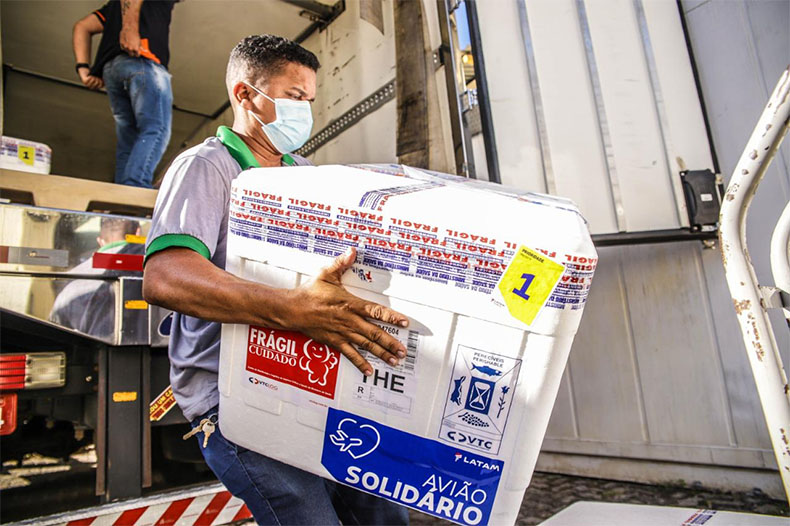 Chegaram 82.250 doses da vacina AstraZeneca/Fiocruz, destinada a vacinação de 100% do grupo de trabalhadores portuários (28 doses), para 78% do público de trabalhadores de transportes aéreos, 17% do grupo de comorbidades e pessoas com deficiência permanente e 7% do público de forças de segurança e salvamento e forças armadas.