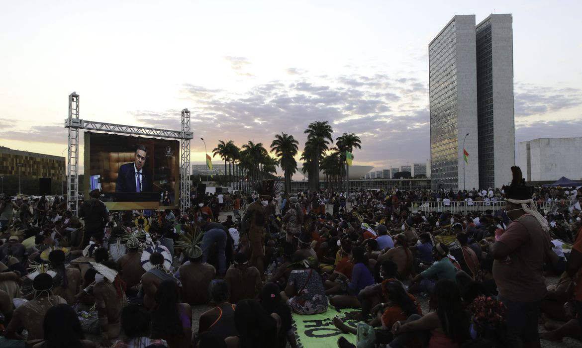 A sessão está sendo acompanhada por cerca de 6 mil indígenas de 170 povos, que estão acampados em Brasília. Desde o último domingo, os indígenas estão no acampamento Luta pela Vida, na Esplanada dos Ministérios, onde recebem visitas de apoiadores da sociedade civil e políticos.