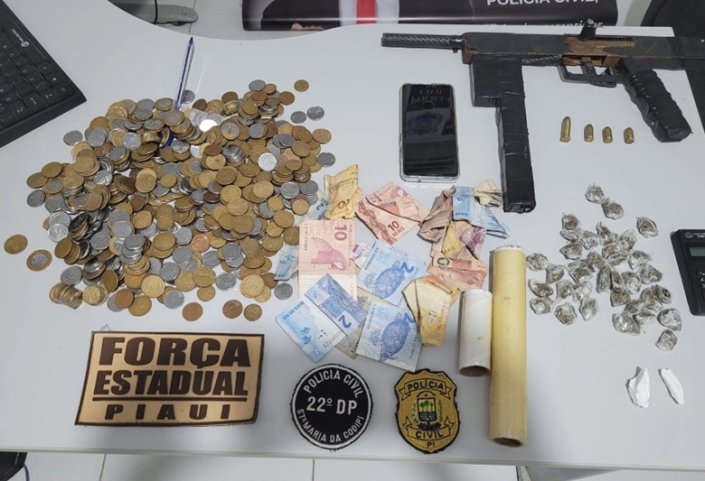 No local estava apenas uma mulher e foram apreendidas uma submetralhadora artesanal, drogas, muito dinheiro trocado e uma máquina para cartão.