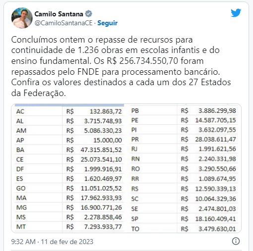 Os recursos, segundo a pasta, são destinados a municípios de todas as regiões do país e foram encaminhados para processamento bancário. Os estados que receberam maior repasse são Bahia (R$ 47,3 milhões), Paraná (R$ 28 milhões), Ceará (R$ 25 milhões) e São Paulo (R$ 18,1 milhões).