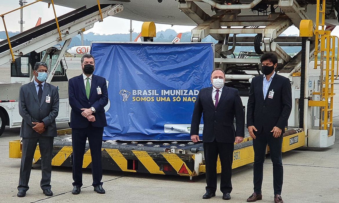 Para o recebimento da carga, estão presentes no local os ministros da Saúde Eduardo Pazuello, das Relações Exteriores, Ernesto Araújo, e das Comunicações, Fábio Faria. De lá, as vacinas serão encaminhadas para o Rio de Janeiro.