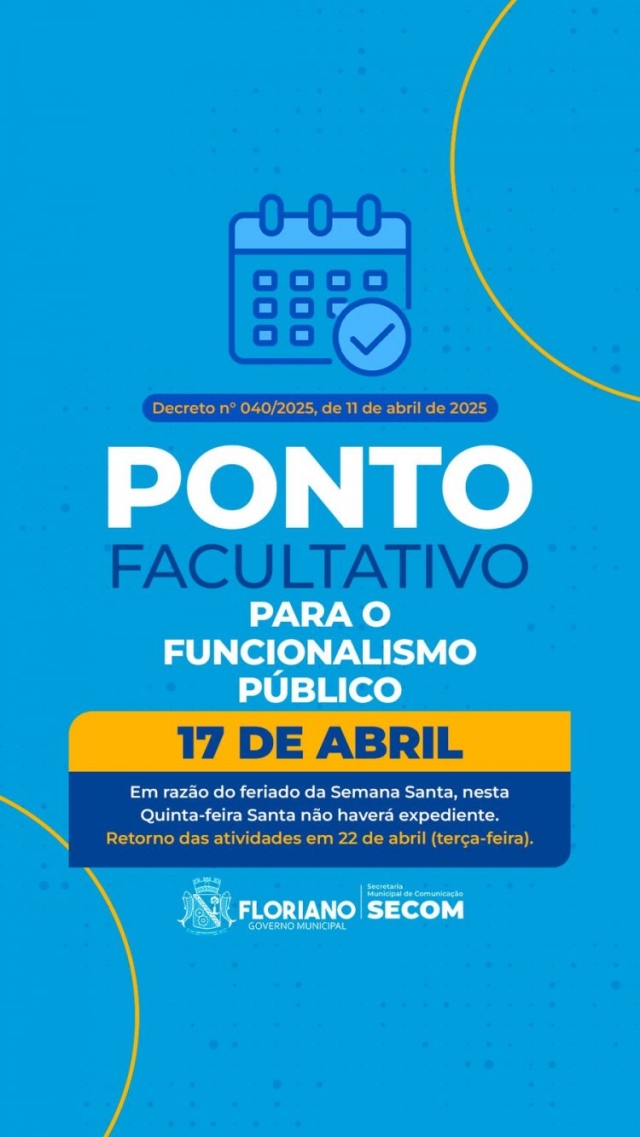 A Prefeitura de Floriano, através da Secretaria Municipal de Governo, tornou público o decreto de nº 040/2025, que declara ponto facultativo para o funcionalismo público municipal nesta quinta-feira, 17 de abril (Quinta-feira Santa).