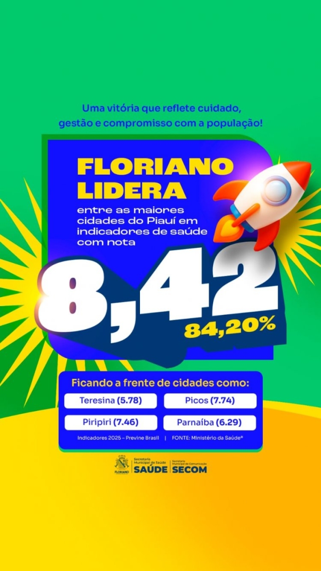 Floriano consolida-se como referência em saúde pública no estado do Piauí, alcançando o melhor desempenho entre os maiores municípios piauienses, segundo os mais recentes dados do programa Previne Brasil 2025, do Ministério da Saúde. Com índice de 8,42 (equivalente a 84,20%), o município supera cidades importantes como a capital Teresina (5,78), Picos (7,74), Parnaíba (6,29) e Piripiri (7,46).
