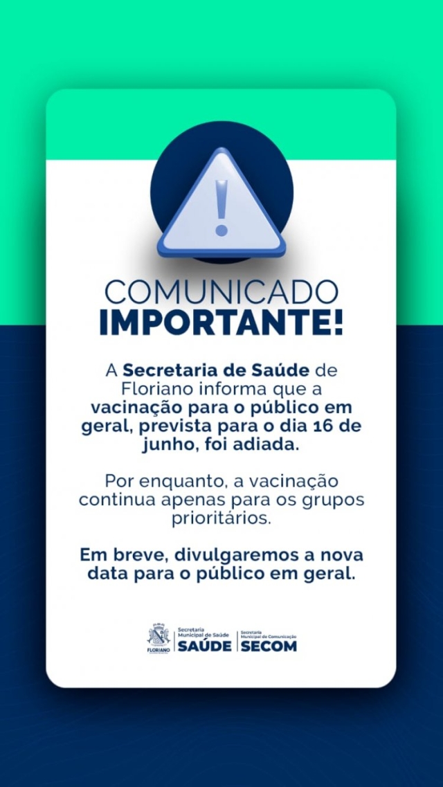 A Secretaria de Saúde havia previsto ofertar a vacina para toda a população dia 16 de junho. Porém, a data foi adiada. No momento, a imunização continua disponível apenas para os grupos prioritários. A nova data para o público em geral será divulgada em breve.