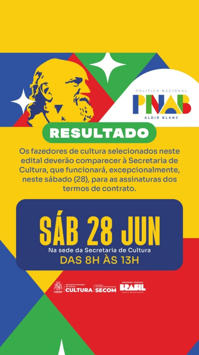 Excepcionalmente, neste sábado (28/06), a Secretaria de Cultura estará funcionando para assinatura do termo de contrato. Tanto o resultado final quanto o aditivo foram oficialmente publicados e estão disponíveis, na íntegra, por meio dos links a seguir: