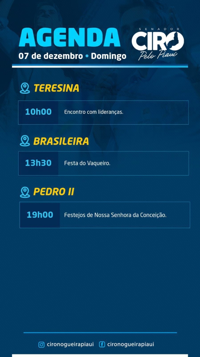 O senador Ciro Nogueira cumpre agenda, neste domingo (07), em Teresina, onde participa de solenidade com lideranças, em Brasileira, prestigiando a Festa do Vaqueiro, e em Pedro II, no tradicional festejo de Nossa Sra da Conceição.